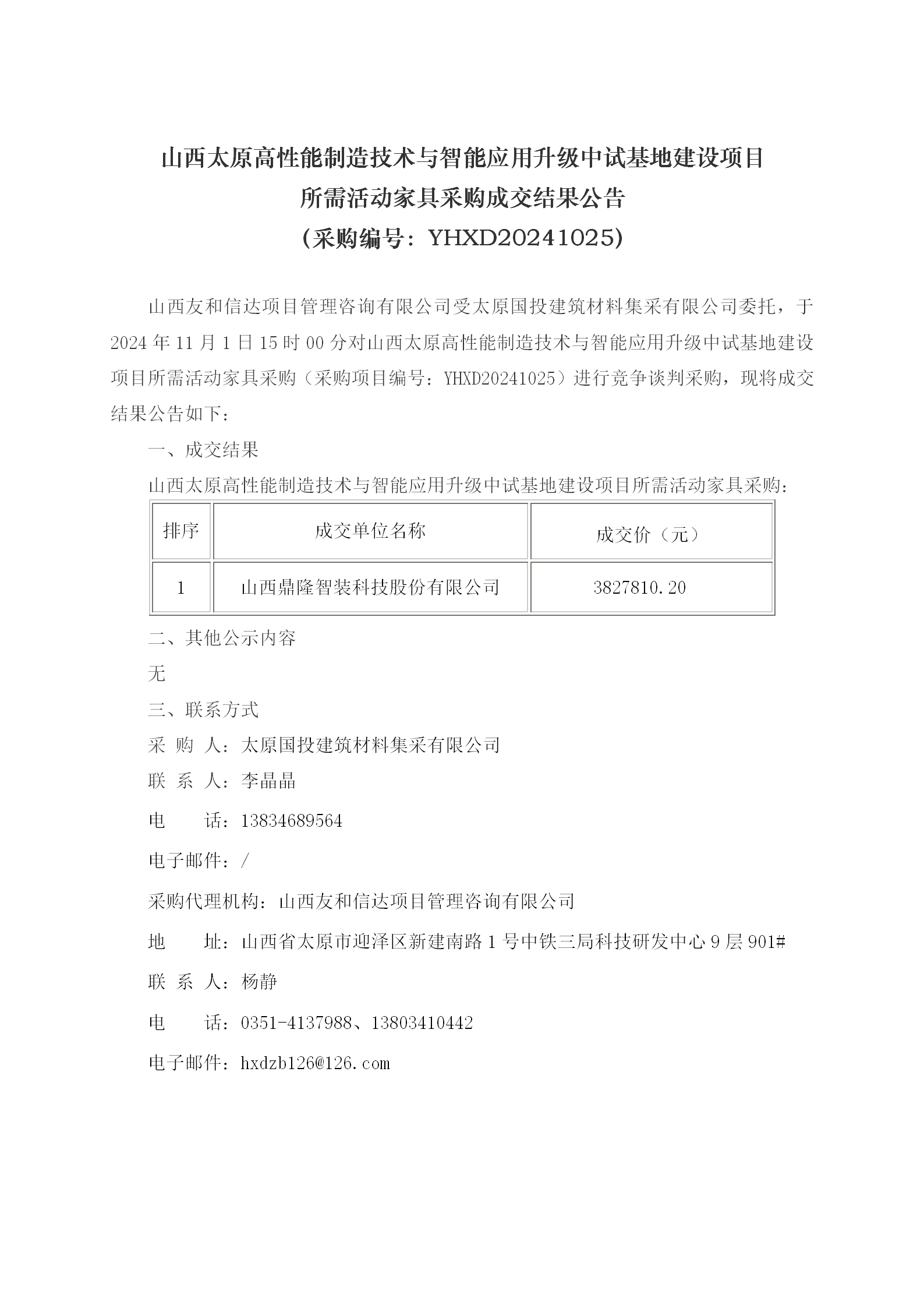 山西太原高性能制造技術與智能應用升級中試基地建設項目所需活動家具采購成交結果公告
