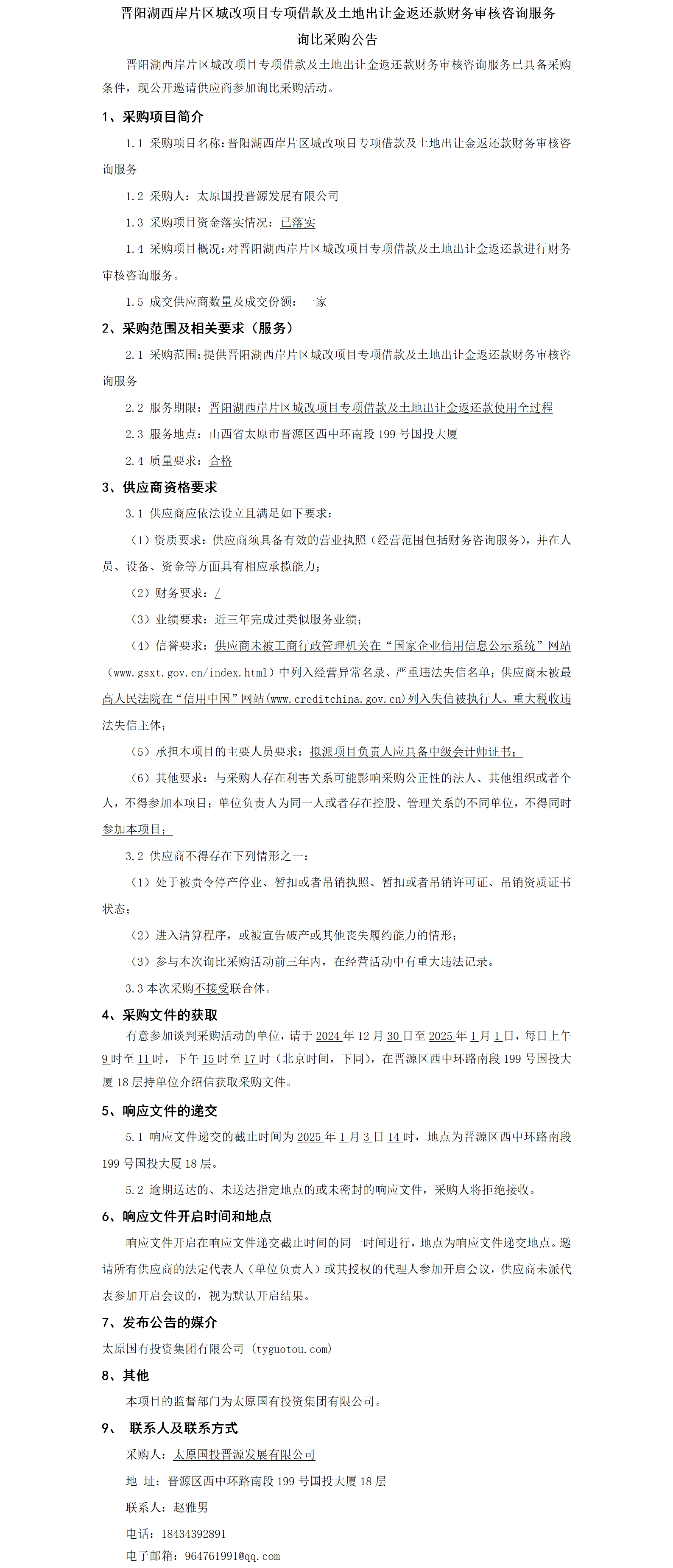 晉陽湖西岸片區城改項目專項借款及土地出讓金返還款財務審核咨詢服務詢比采購公告