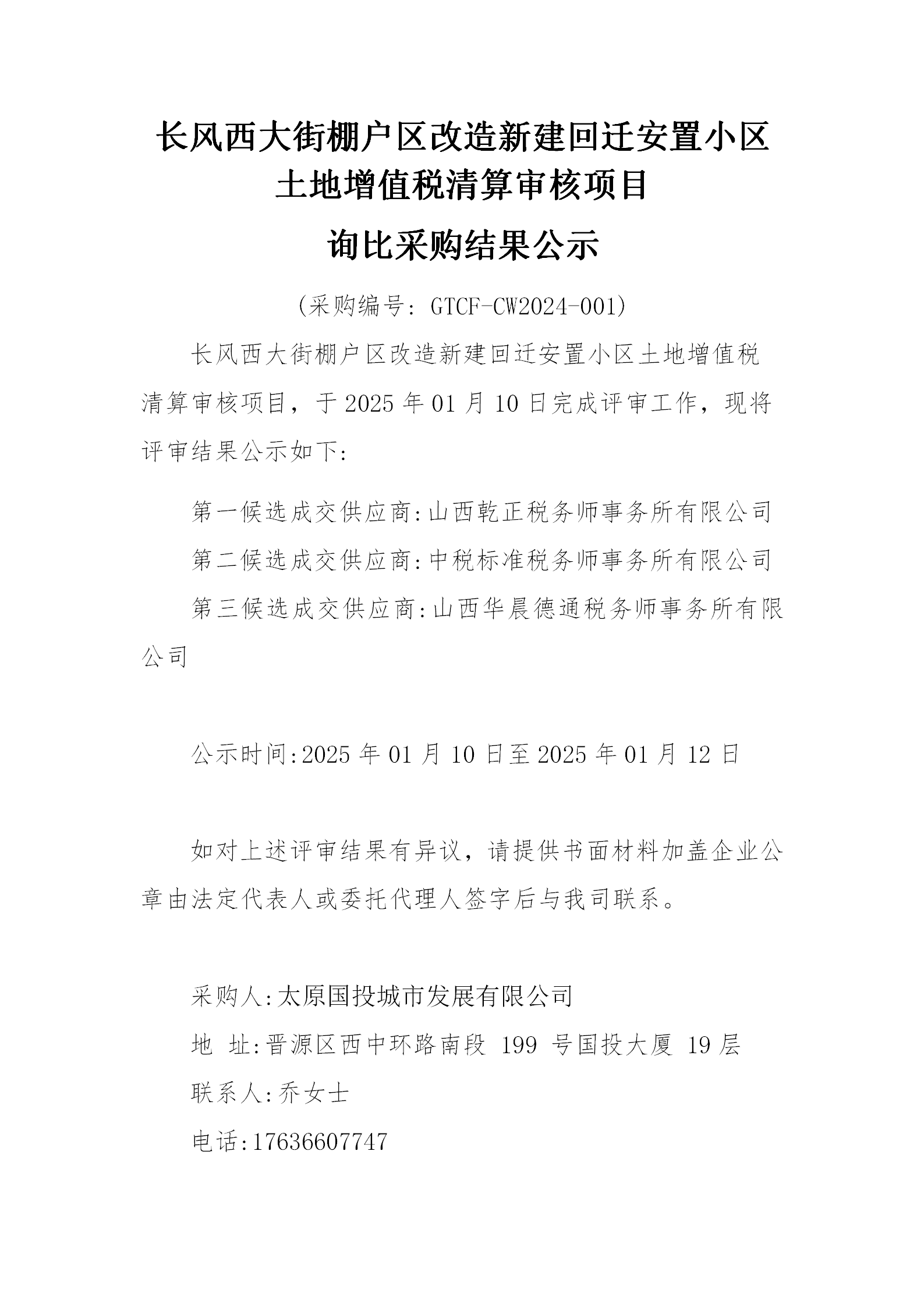 關于長風西大街棚戶區改造新建回遷安置小區土地增值稅清算審核項目詢比采購結果公示的發布申請
