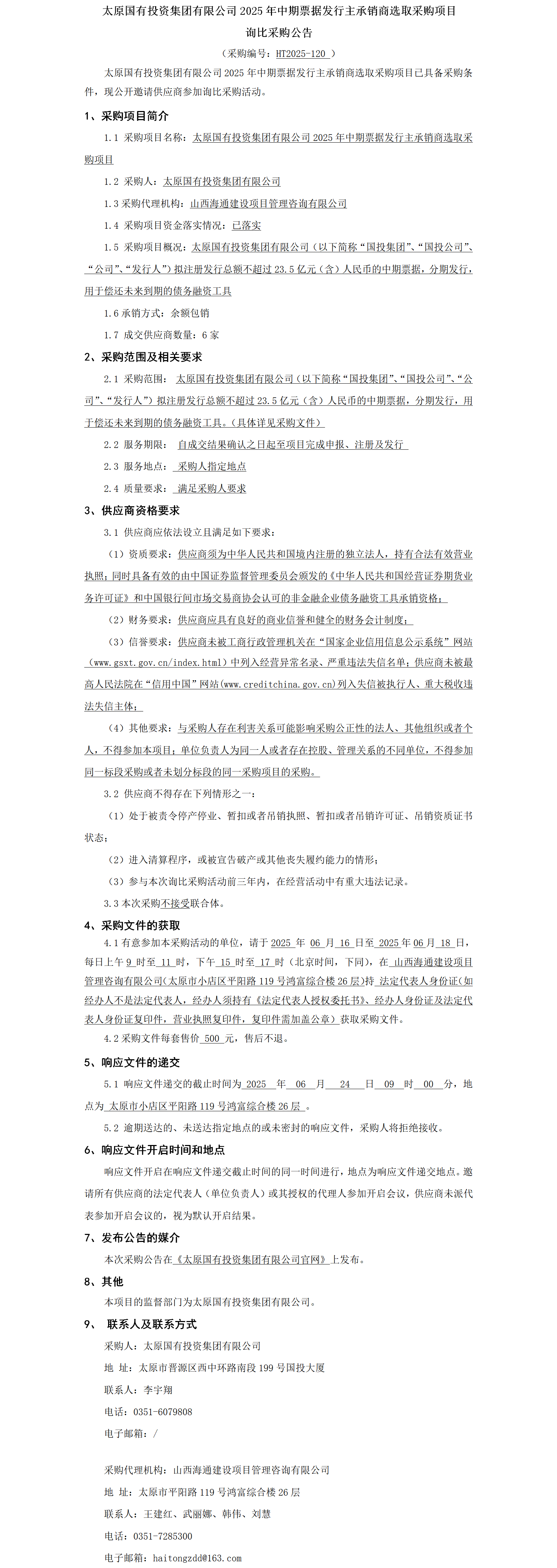 太原國(guó)有投資集團(tuán)有限公司2025年中期票據(jù)發(fā)行主承銷(xiāo)商選取采購(gòu)項(xiàng)目詢(xún)比采購(gòu)公告