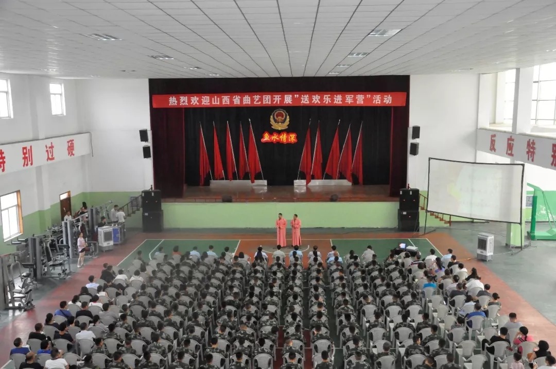 隨后,慰問組成員隨武警官兵們在支隊綜合訓練館觀看了專場慰問演出。演出在歌曲《當兵的人》中拉開序幕。整臺節目形式多樣、內容豐富,有曲藝京東大鼓《夸太原》,有太原獨特的蓮花落《老街老巷》,有詼諧幽默的相聲《咱爺爺》和《我是歌手》,還有觀眾連連拍手叫好的快板《看升旗》,最后演出在一首朗誦《人民萬歲》中落下帷幕。